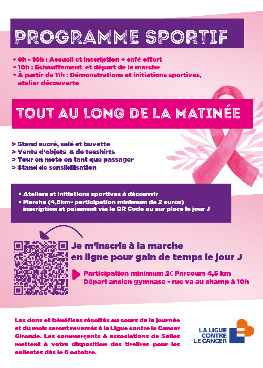 🌸 Marche rose (départ à 10h – participation 2€ minimum reversés à la Ligue contre le cancer Gironde)