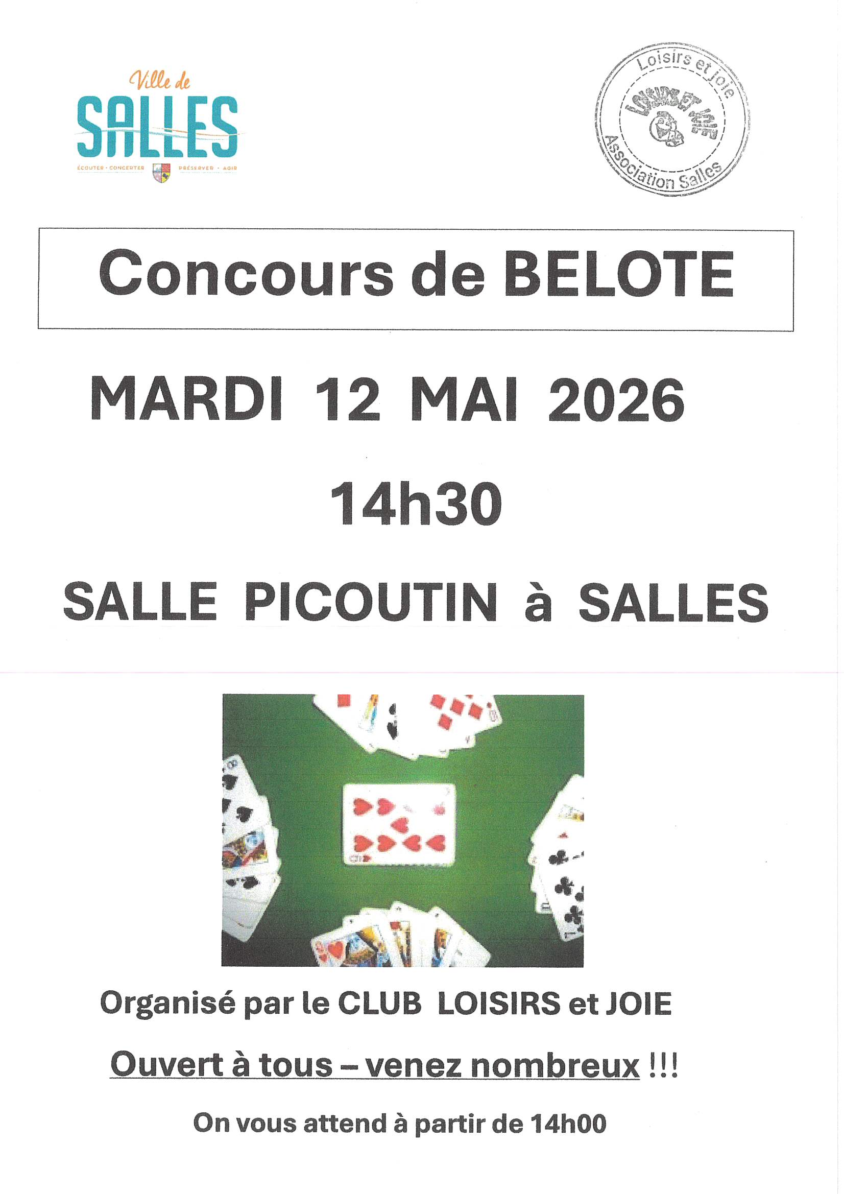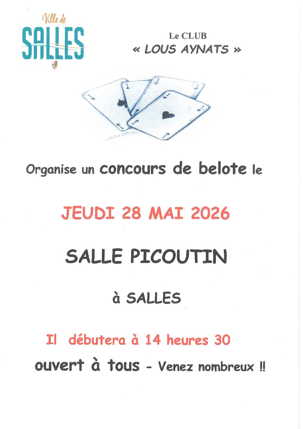 Concours de belote ouvert à tous ! Salle Picoutin Il débutera à 14h30 Venez nombreux!